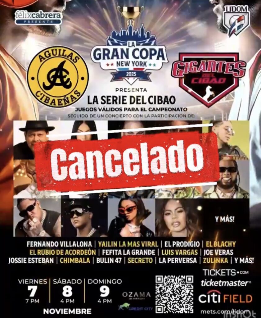 Latin Events anunció que la Copa del Cibao New York 2025, que enfrentaría a Águilas Cibaeñas y Gigantes del Cibao del 7 al 9 de noviembre en el estadio Citi Field, ha sido cancelada. La empresa explicó que las recientes acciones migratorias han generado un clima de miedo y ansiedad en comunidades dominicanas y latinas de Nueva York, Nueva Jersey, Connecticut y Massachusetts, lo que ha provocado que muchas personas…