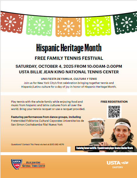Esta gran fiesta para la comunidad (HISPANIC HERITAGE MONTH/FREE FAMILY TENNIS FESTIVAL) se realiza con el aval de la United States Tennis Association (USTA), el organismo rector del tenis en EEUU, y su entidad regional USTA Eastern.