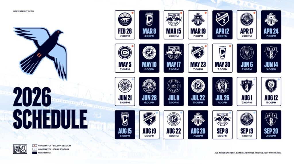 El New York City FC II anunció hoy su calendario para la próxima temporada 2026 MLS NEXT Pro. El Club jugará 28 partidos en la conferencia mientras la MLS NEXT Pro entra en su quinto año.