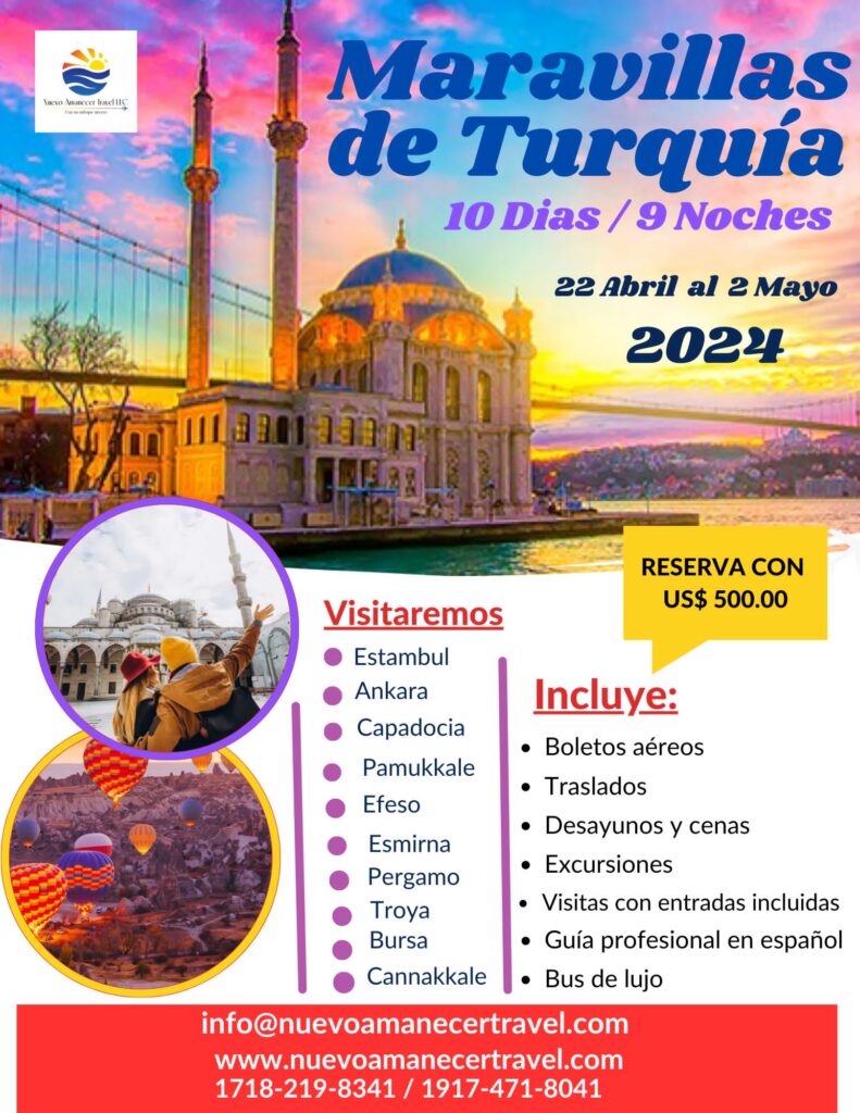La agencia de viaje Nuevo Amanecer oferta un grandioso tour hacía Turquía, bajo el nombre “Maravillas de Turquía”. El Tour tendrá una duración de 10 días y 9 noches, en las cuales visitarán las ciudades de Estambul, Ankara, Capadocia, Pamukkale, Efeso, Esmirna, Pergamo, Troya, Bursa y Cannakkale. Puedes hacer tu reservación con $ 500 dólares, el paquete completo incluye Boletos, transportes en Turquía, comida, excursiones, visitas a sitios turísticos y…
