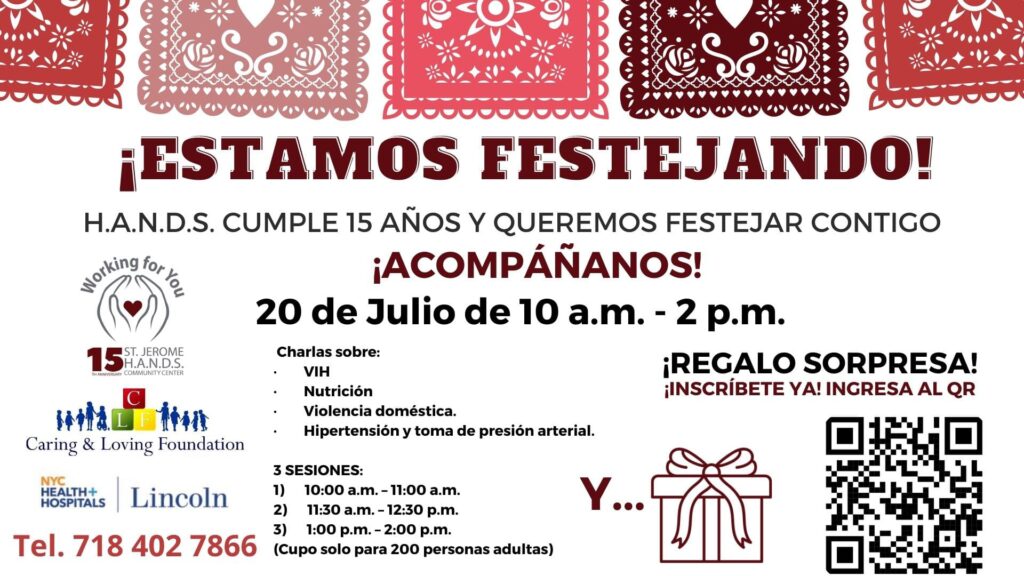 El próximo 20 de julio se realizará la celebración del aniversario de la organización H.A.N.D.S. en el cual se desarrollarán charlas sobre VIH, Nutrición, Violencia Doméstica e Hipertensión. El evento se realizará en tres sesiones a desarrollarse a las 10:00 A.M, 11:30 A.M y 1:00 P-M- Los cupos son limitados inscríbete escaneando el código QR en la imagen y para más información puedes comunicarte al número 718-402-7866.