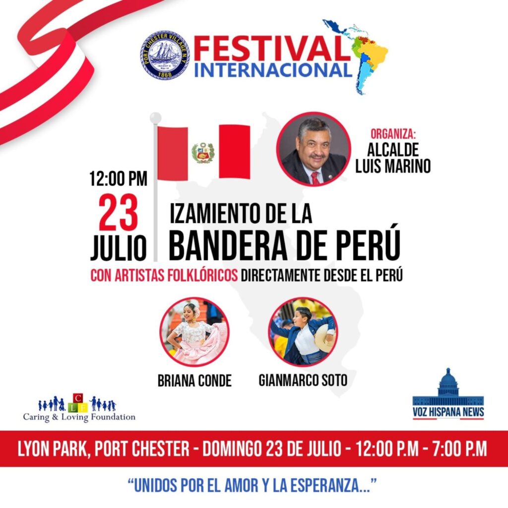 Este 23 de Julio, se realizará durante el Festival Internacional 2023, el izamiento de la bandera peruana en celebración a la independencia del país Andino, organizado por el alcalde de Port Chester, Luis Marino. En el evento participarán artistas peruanos como Briana Conde y Gianmarco Soto. El evento se desarrollará en el Lyon Park a partir de las 12:00 MD a las 7:00 PM.