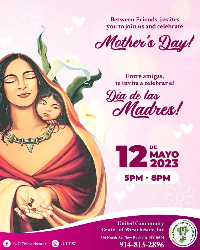 La organización United Community Center of Westchester, Entre Amigas invita a celebrar el Día de las Madres este 12 de mayo a partir de las 5:00 PM. El evento se realizará en 360 North Av. New Rochelle, NY 10801, para mayor información puede comunicarse con el teléfono: 914-813-2896. Al registrarse al evento, se le solicitará asistir sin niños.