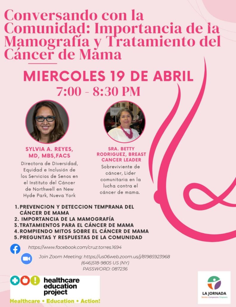 Las organizaciones, Healthcare Education Project junto a La Jornada, desarrollarán este próximo miércoles 19 de abril, un conversatorio virtual titulado, “Importancia de la Mamografía y Tratamiento del Cáncer de Mama”. El conversatorio iniciará a las 7:00 P.M y contará con la participación de la señora Sylvia Reyes, Directora de Diversidad, Equidad e Inclusión de los Servicios de Senos en el Instituto del Cáncer de Northwell en New Hyde Park, Nueva…