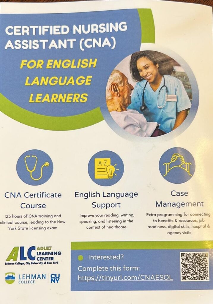 El Centro de Aprendizajes para Adultos ofrece cursos Certificados de Enfermería para estudiantes de Inglés. Lehman College Adult Learning Center (ALC) y la Escuela de Estudios Profesionales y Continuos (SCPS) se han asociado para ofrecer este programa de capacitación CNA aprobado por el NYSED para hablantes no nativos de inglés que buscan empleo en hospitales, asilos de ancianos, hospicios, hogar y agencias de salud. El Curso de Certificado consta de…