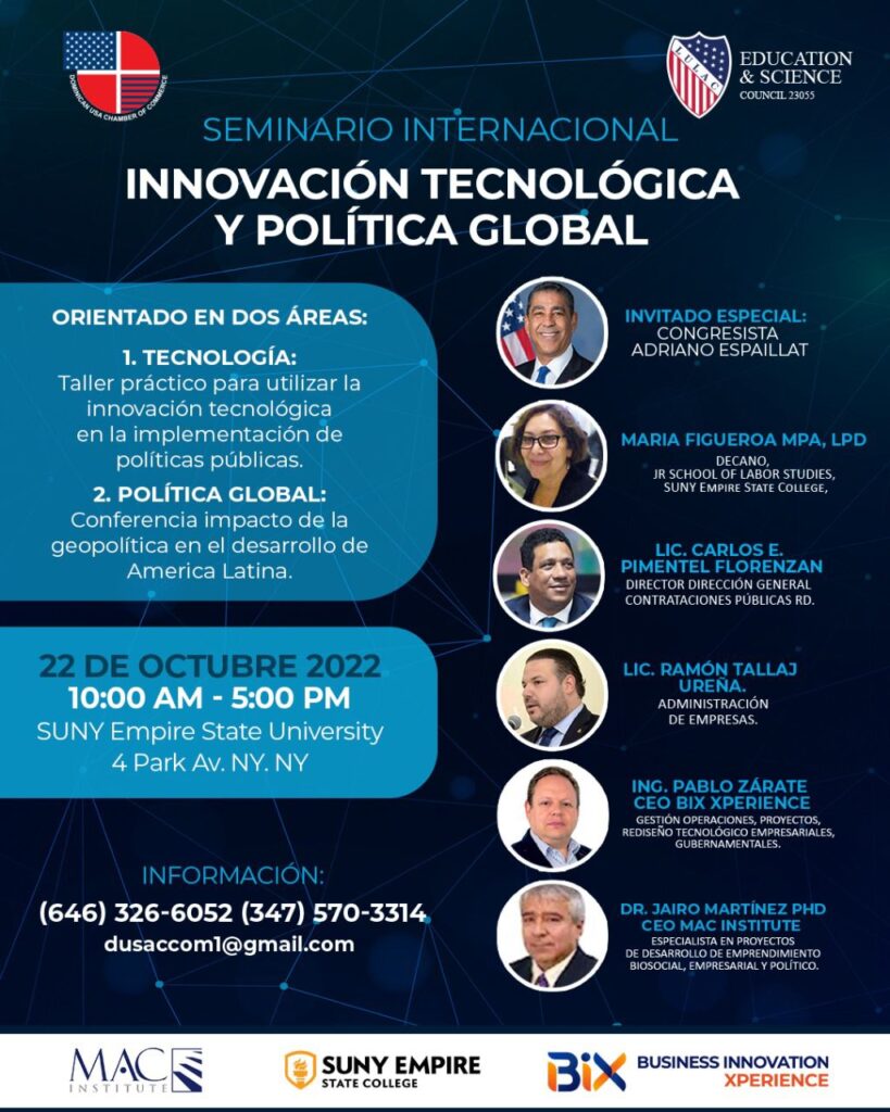La Liga de Ciudadanos Latinoamericanos Unidos (LULAC) y la Cámara de Comercio Dominicana (DUSACOM) organizan un seminario internacional con fines educativos al que asistirán invitados y expertos oradores. Con la coordinación de eBiz Connectors, empresa liderada por la Sra. Sylvia Mata, representante de LULAC y mujeres en Nueva York, realizarán esta conferencia presencial sobre innovación tecnológica y política global, bajo el tema de Tecnología: un taller práctico enfocado en la…