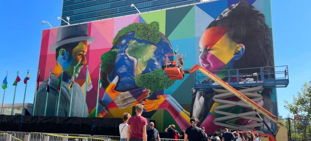 Los líderes mundiales que lleguen a la sede de la ONU para las reuniones de alto nivel de la Asamblea General de la próxima semana, serán recibidos por un nuevo mural poderoso y sorprendente del renombrado artista brasileño Eduardo Kobra, que centra la atención en el cambio climático y la administración del planeta. El panel, que se extiende a lo largo de la entrada de la Primera Avenida, justo por encima de…
