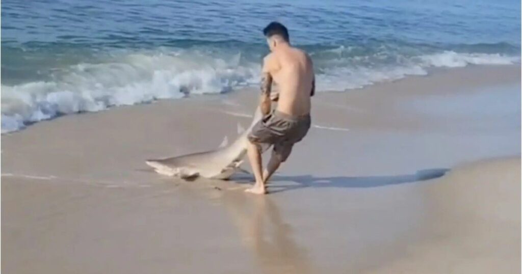 Un video muestra como un hombre arrastraba a un tiburón en una playa de Long Island, en Nueva York, el pasado domingo por la mañana en la playa Smith Point en Fire Island. En el video se puede observar como un hombre arrastra a lo que parece ser un tiburón tigre de poco más de un metro de tamaño. Al parecer el hombre trata de quitarle un anzuelo y lo intenta arrastrar fuera del agua…