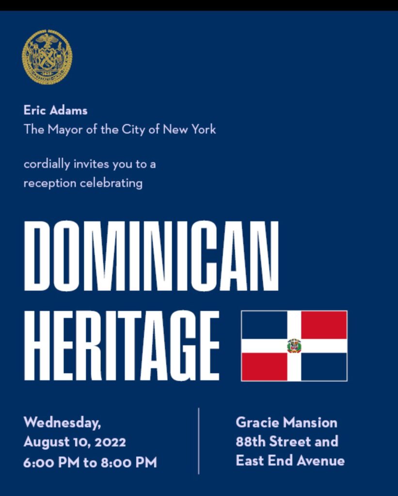 El Alcalde de Nueva York, Eric Adams, invita a los neoyorquinos a participar de la celebración de la Herencia Dominicana. El evento se celebrará el miércoles 10 de agosto en la Mansión Gracie, Calle 88 y Avenida East End a partir de las 6:00 hasta las 8:00 P.M. Agradecemos la cordial invitación por parte la Sra. Charito Cisneros, Presidenta de La Cámara de Cosmetologia de Nueva York.