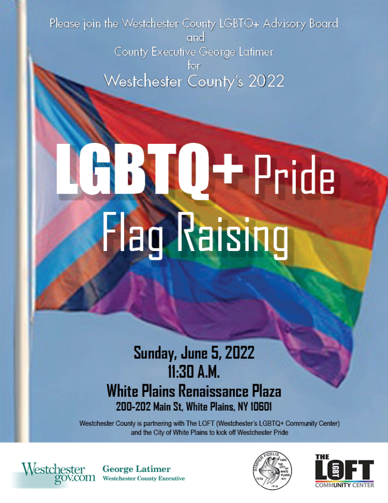 La Junta Asesora LGBTQ+ del condado de Westchester y el ejecutivo del condado George Latimer invitan al evento Izamiento de la Bandera del orgullo de la comunidad. El evento se desarrollará el Domingo, 5 de junio de 2022 a partir de las 11:30 de la mañana en White Plains Renaissance Plaza