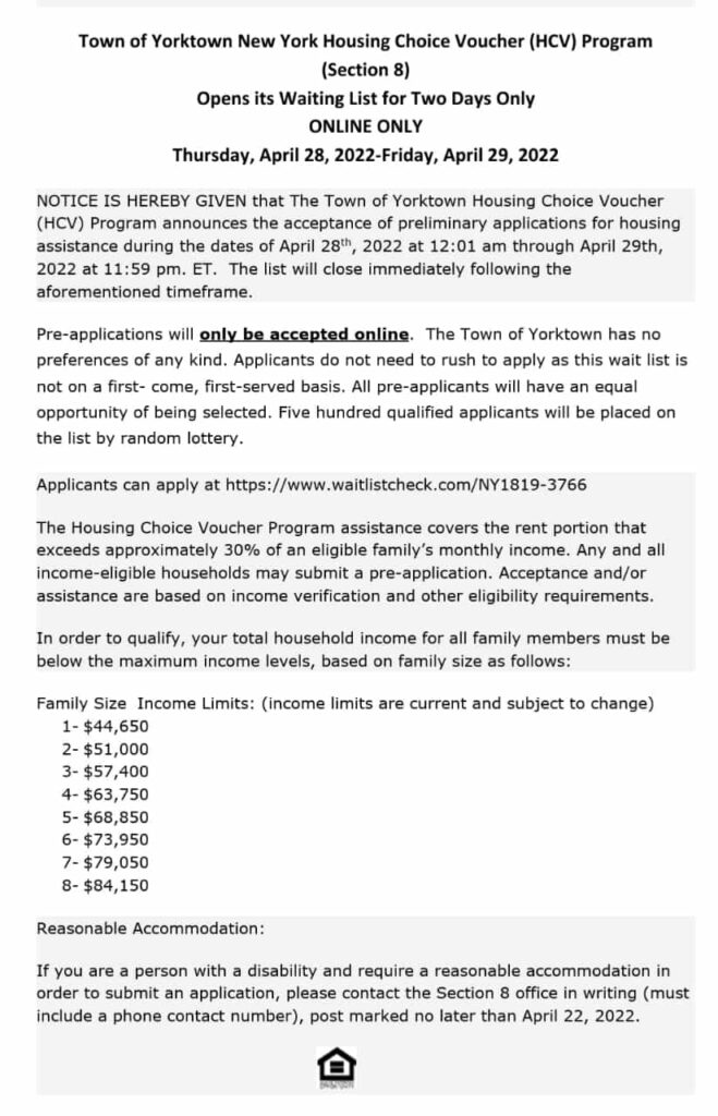 El pograma de vales de elección de vivienda en Yorktown ha iniciado la aceptación de solicitudes preliminares para la asistencia de vivienda. Este período estará disponible los días 28 y 29 de abril. Es importante estar señalar que la elección de las solicitudes no se realizará en orden de llegada, sino que serán 500 solicitudes que entrarán en un sorteo al azar. La solicitud debe realizarse en https://www. waitlistcheck.com/NY1819-3766. Para…