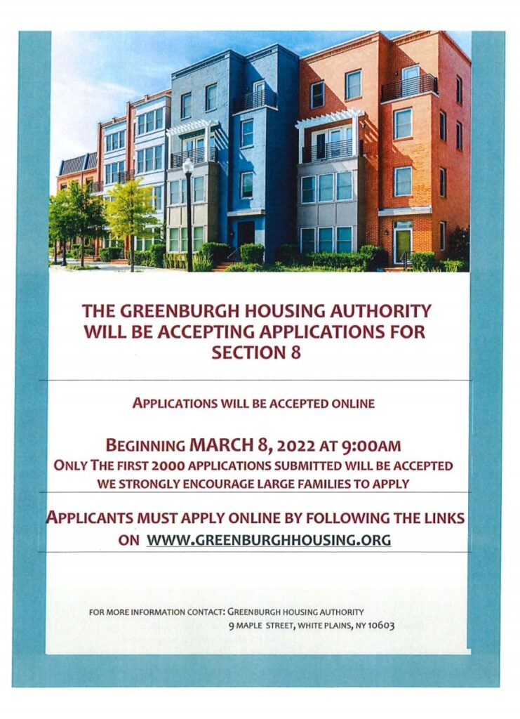 A partir del 8 de marzo, las autoridades de viviendas de Greenburgh aceptarán solicitudes para la sección 8. Las solicitudes serán aceptadas en línea, a través del correo greenburghhousing.org, con un cupo limitado de 2,000 solicitudes. Las familias numerosas pueden presentar su solicitud. Para mayor información contactar a Greenburgh Housing Authorithy en 9 maple, White Plains, NY 10603.