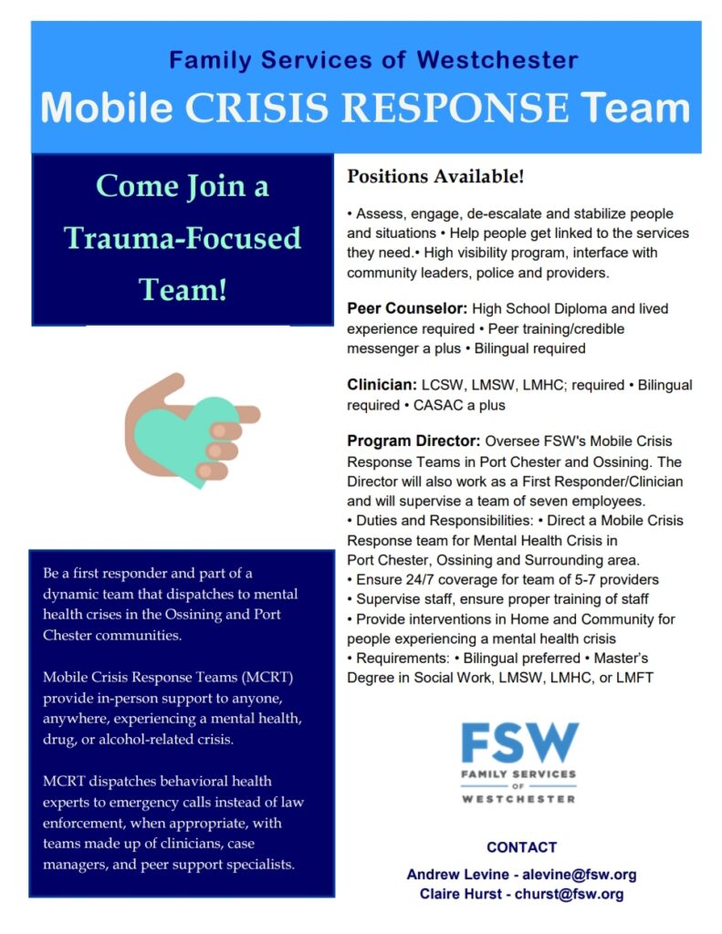 Sea un socorrista y parte de un equipo dinámico que responde a una crisis de salud mental en la comunidad de Ossining y Port Chester. El Equipo móvil de respuesta a crisis (MCRT) brinda apoyo a cualquier persona, en cualquier lugar, que experimente una crisis relacionada con la salud mental, las drogas o el alcohol. MCRT envía expertos en salud del comportamiento a las llamadas de emergencia en lugar de…