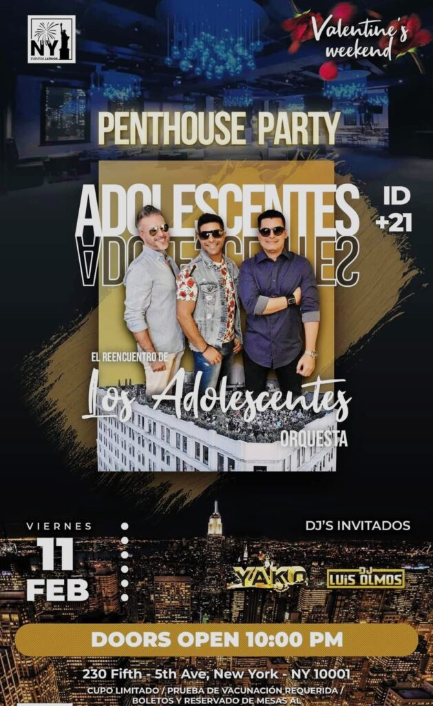 Llega a Nueva York la fiesta conmemorativa de San Valentín, este viernes 11 de febrero en 230 fifth-5th Avenue New York a partir de las 10:00 PM. Celebrando con el reencuentro de la orquesta Los Adolescentes y Djs invitados Yakos y Luis Olmos. Para participar deberás presentar tu tarjeta de vacunación y ser mayor de 21 años.