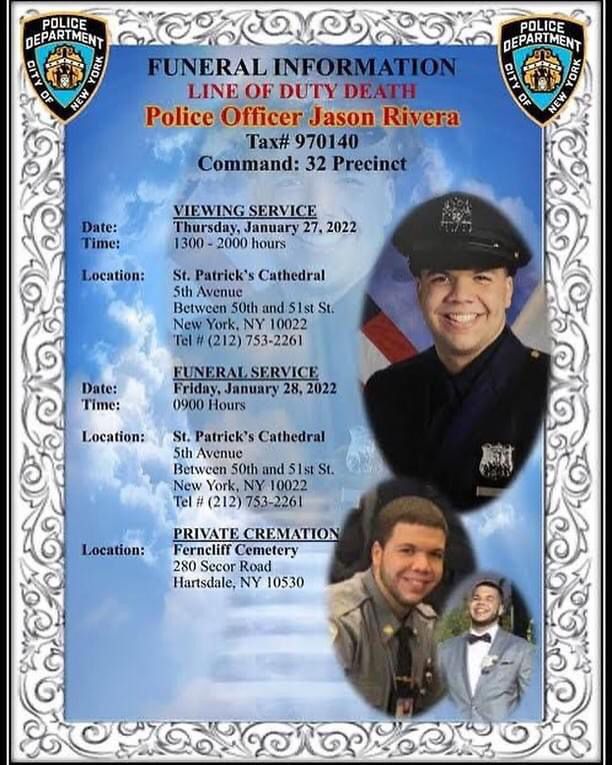 El departamento de Policía de Nueva York invita a las honras funebres del oficial Jason Rivera, quien falleció la semana pasada después de sufrir un impacto de bala en su rostro. Jason, junto a otro oficial que permanece en el hospital, atendieron una llamada de violencia doméstica y al llegar fueron recibidos a disparos. las ceremonias se realizarán el día 27 de enero en la catedral de San Patricio de…