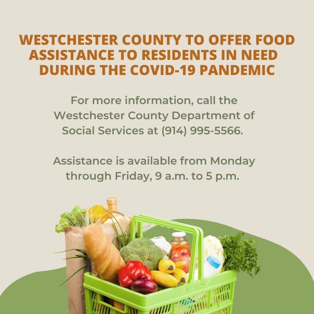 El condado de Westchester ofrecerá asistencia alimentaria a los residentes que lo necesiten durante la pandemia de covid 19. Para obtener más información, llame al departamento de servicios sociales del condado de Westchester al (914) 995-5566. La asistencia está disponible de lunes a viernes, de 9 a. m. a 5 p. m.