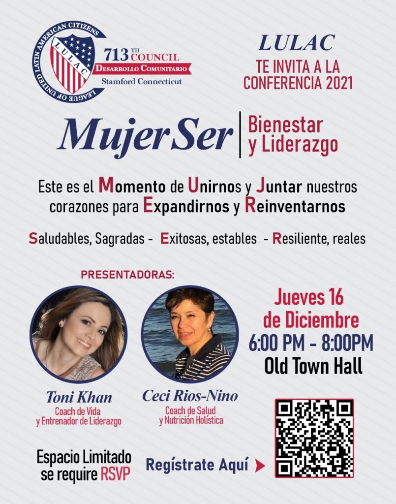 La Liga de los Ciudadanos Latinoamericanos Unidos (LULAC) invita a la conferencia “Mujeres Ser, Bienestar y Liderazgo”. El evento contará con la participación de las presentadoras Toni Khan; coach de vida y entrenadora de liderazgo y Cesi Rios-Niño; coach de Salud y nutrición holistica. Se abordarán temas como, Salud, éxito y resilencia. El evento se realizará el día 16 de diciembre de 6:00 a 8:00 P.M en el Old Town…